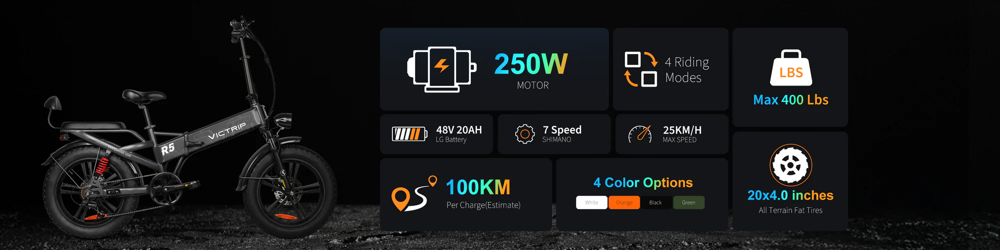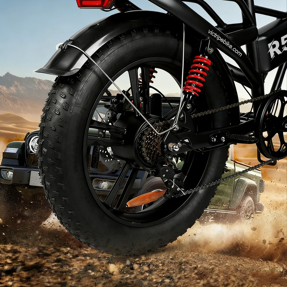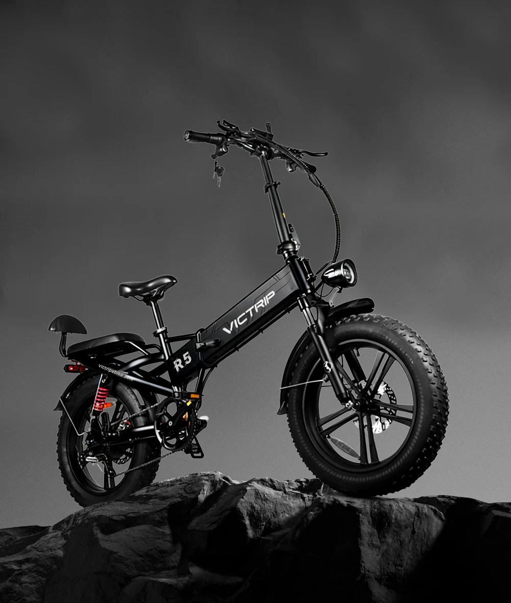 The Victrip R5 is a versatile, foldable all-terrain ebike featuring a robust 48V 20Ah battery and a powerful rear motor, offering up to 100km range and 85Nm torque. Designed for comfort and performance, equipped with 20″x4.0″ fat tires, full suspension, and an extra-thick saddle to handle 30-35° inclines and uneven terrain. Safety is assured through 180mm hydraulic disc brakes and a complete integrated lighting system. Its efficient 15-second folding mechanism enhances portability for easy storage and transport